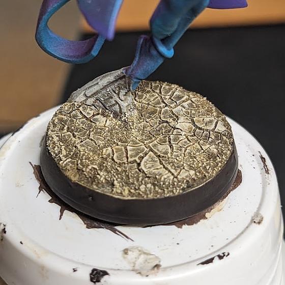 I initially apply PVA glue and sand to the base so the crackle paint will have something to stick to, I found the crackle paint peels right off if applied directly to the plastic base.
